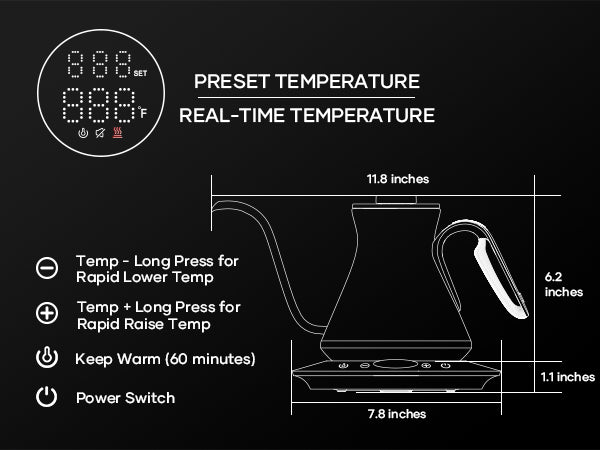 Kettle Body/Power Base Included Dimensions: Approx. L11.8 x W5.6 x H6.4 in / L1.1 x W1.1 x H28 in